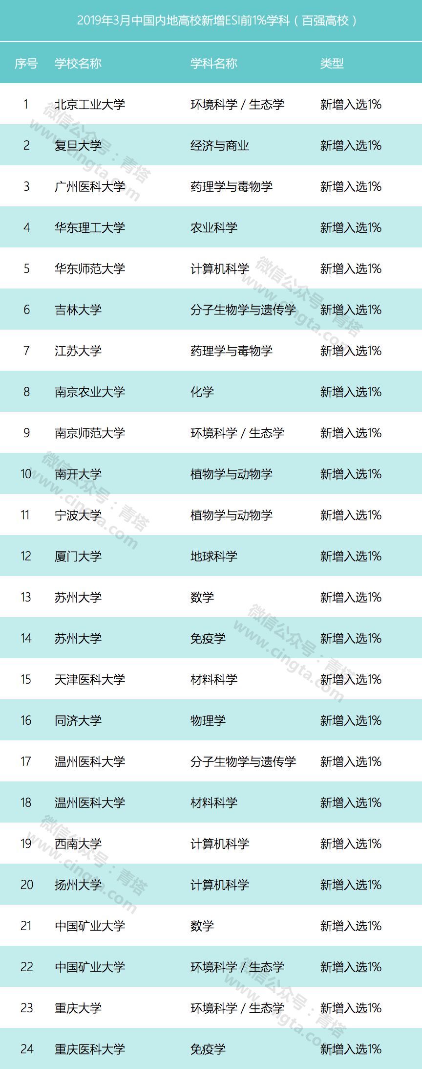最新 | 2019年3月ESI中国大学综合排名百强!各高校哪些学科新进前1%?发表时间:2018-12-26 00:00 3月14日,ESI数据库更新了2019年3月最新ESI数据(数据统计覆盖时间为2008年1月1日-2018年12月31日),这也是2019年第二期的ESI数据。据统计,全球共有6009家科研机构上榜。 青塔整理了2019年3月的各校ESI综合排名情况(按照各高校论文总引用次数进行排名;中国地质大学、中国石油大学和中国矿业大学三所高校并没有区分两地办学的情况),同时与2019年1月的排名情况进行了比较,一起来看一看。 大多数百强高校国际排名进步 从统计数据来看,本期(2019年3月)百强高校ESI综合排名相比上一期(2019年1月)有一定幅度进步。 各大高校中,近年来飞速发展的中国科学院大学国际排名达到88位,位居内地高校第一位。北京大学、清华大学、浙江大学国际排名分别位居89位、94位、107位,居内地高校第2-4位。 中国科学院大学、北京大学、清华大学、浙江大学、上海交通大学、复旦大学和南京大学七所高校进入国际排名前200位,其中南京大学也是首次进入前200位。中国科学技术大学、中山大学和华中科技大学ESI综合排名也进入内地高校前十位,均位居国际排名前270位。 此外,首都医科大学、南京医科大学、第三军医大学、江苏大学、中国医科大学、南京工业大学、南方医科大学、哈尔滨医科大学等地方重点高校表现也不错。 相比2019年1月份,百强高校除6所退步、6所保持不变外,其余88所国际排名均保持进步,这也表明国内高校整体科研实力在进步。本次进步较大的高校包括深圳大学、西南交通大学、中国矿业大学、南京信息工程大学、中国石油大学、青岛大学、广州医科大学、暨南大学、浙江工业大学、华北电力大学等。 百强高校新增ESI前1%学科 相比2018年1月份,本次百强高校中共有21所高校新增学科进入ESI前1%。其中北京工业大学、广州医科大学、复旦大学、华东理工大学和华东师范大学等高校新增ESI前1%学科。 此外,苏州大学、温州医科大学和中国矿业大学表现突出,本次新增2个学科进入ESI前1%。本次新增ESI前1%学科如下: 中国矿业大学数学、环境与生态学2个学科领域首次进入ESI全球前1%。国际排名上升至1283位,较1月份提升30名,是中国内地ESI百强高校中进步最大的高校之一。截止目前,矿大ESI全球前1%学科已达6个,在基础学科建设方面取得重大进展。 苏州大学免疫学、数学两个学科首次进入ESI全球排名前1%。国际排名位列第404位(较2019年1月国际排名提升3位),中国内地高校排名位列第20位,继续位列江苏省内第2位 。截至目前,苏州大学进入全球前1%的学科有11个,分别是:化学、材料科学、临床医学、物理学、工程学、药学与毒理学、生物学与生物化学、神经科学与行为科学、分子生物与遗传学、免疫学、数学。其中化学、材料科学2个学科进入全球ESI排名前1‰。 温州医科大学本期有两个学科进入ESI全球前1%:分子生物学与遗传学、材料科学。国际排名为1237名,较上期上升了13位。截止目前,温州医科大学共有5个学科进入全球前1%,其他三个为临床医学、药理与毒理学、生物与生化学科。 来源:青塔,如有侵权,联系删除! 上一篇高考规划师:杨德玉